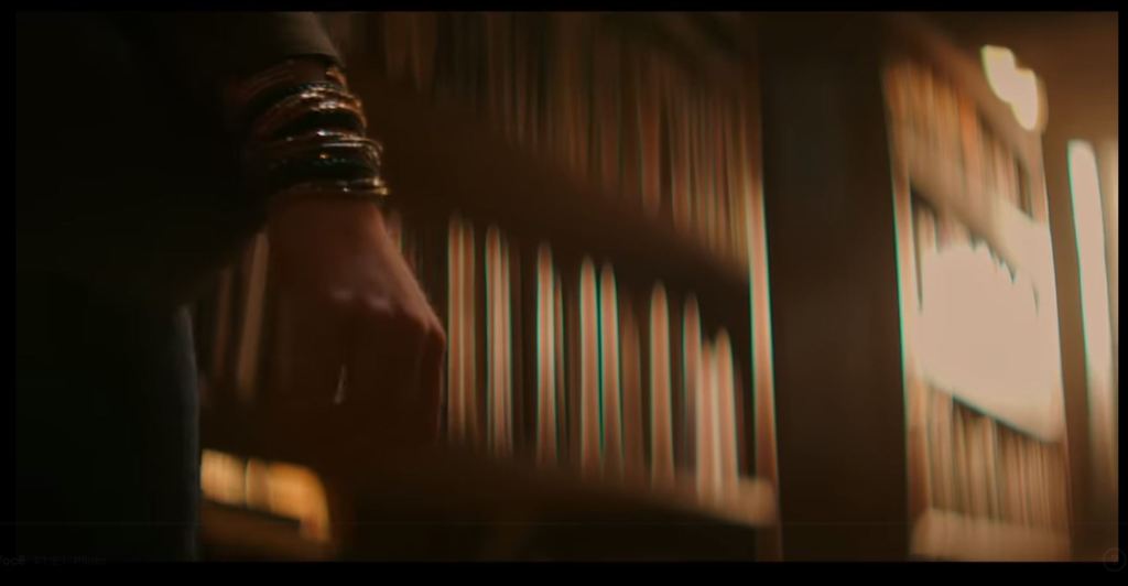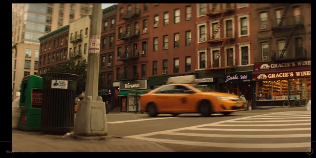 Primeiro temos um plano mais aberto o possível da cidade e logo em seguida uma cena de rua que mostra a fachada da livraria onde a primeira cena acontece. Mas diferente do que estamos habituados, a apresentação do ambiente é muito curta logo partimos para os detalhes de uma pessoa entrando na loja.